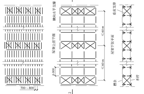 垂直支撐位于上、下弦橫向水平支撐同一開間內(nèi),形成一個跨長為屋架間距的平行弦桁架。它的上、下弦桿分別為上、下弦橫向水平支撐的豎桿,它的端豎桿就是屋架的豎桿(或斜腹桿)。垂直支撐中央腹桿的形式由支撐桁架的高跨比決定,一般常采用W形或雙節(jié)間交叉斜桿等形式。腹桿截面可采用單角鋼或雙角鋼T形截面。